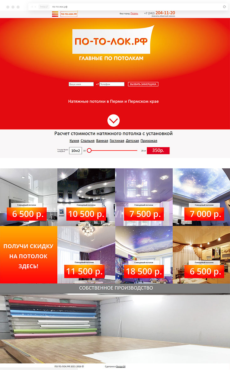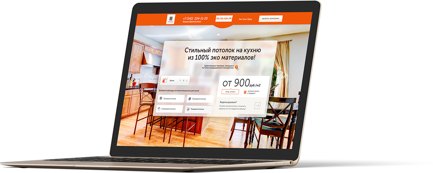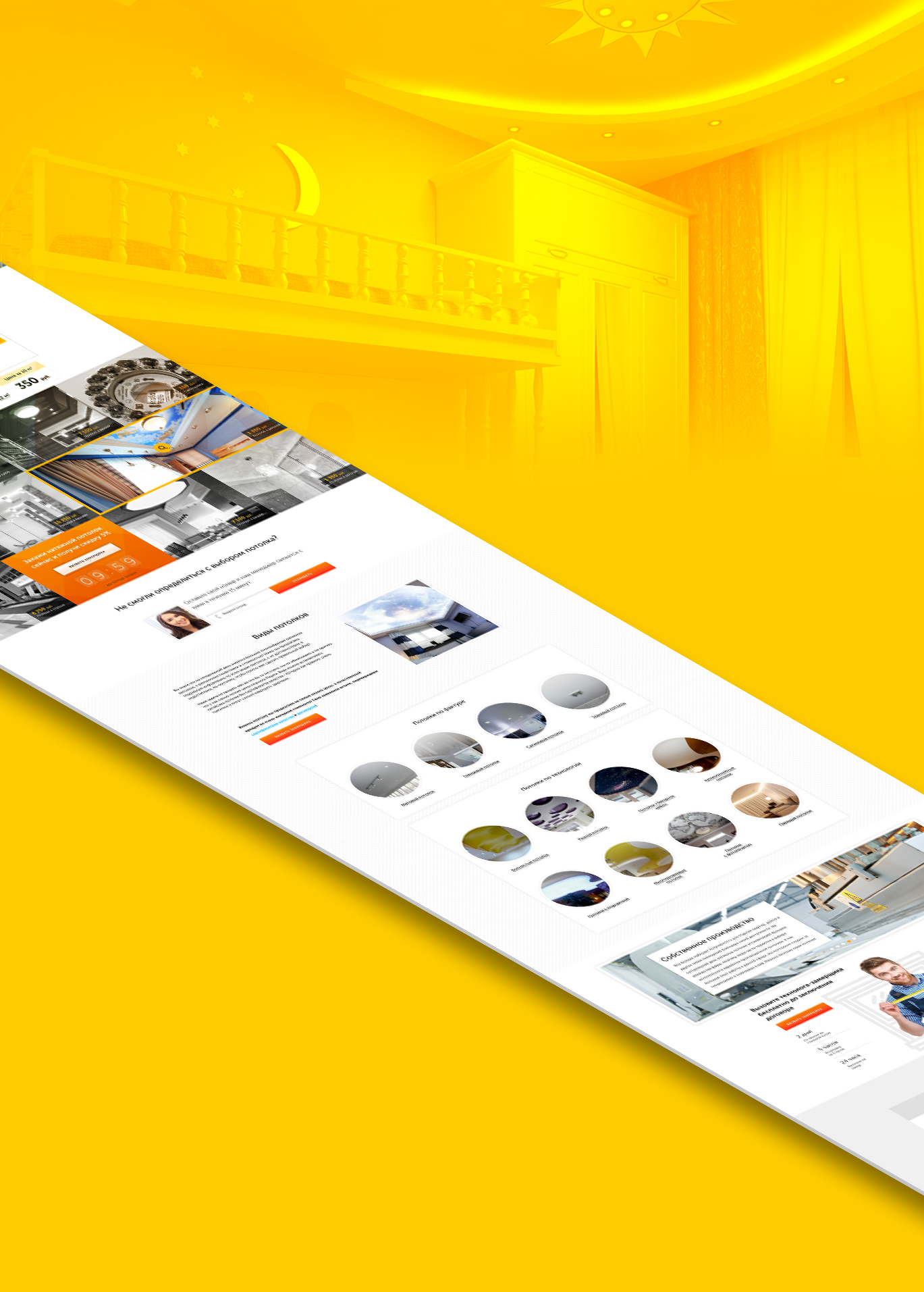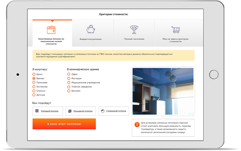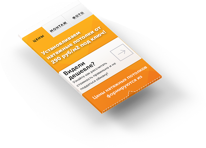 Определили "боли" каждого сегмента, разработали уникальный оффер (продающий заголовок) на каждый вид потолка. Выделили и описали преимущества по каждому виду потолка в наглядной форме с помощью специально разработанных иконок.